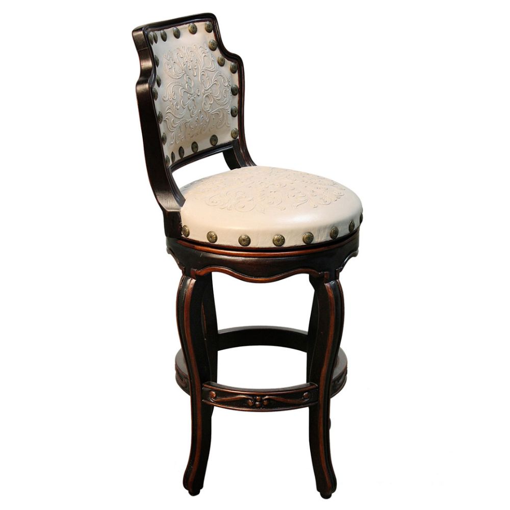 Elevate your kitchen or bar with the Blanca Hacienda Leather Swivel Counter Stool, where traditional craftsmanship meets contemporary comfort. Each stool showcases hand-tooled leather adorned with an intricate floral motif and accented with antique brass studs that frame the seat. The carved wooden legs complete this artisan piece, reflecting meticulous attention to detail throughout. Perfect for those who appreciate authentic design and quality construction, this swivel stool brings warmth and character to any space while providing reliable seating.